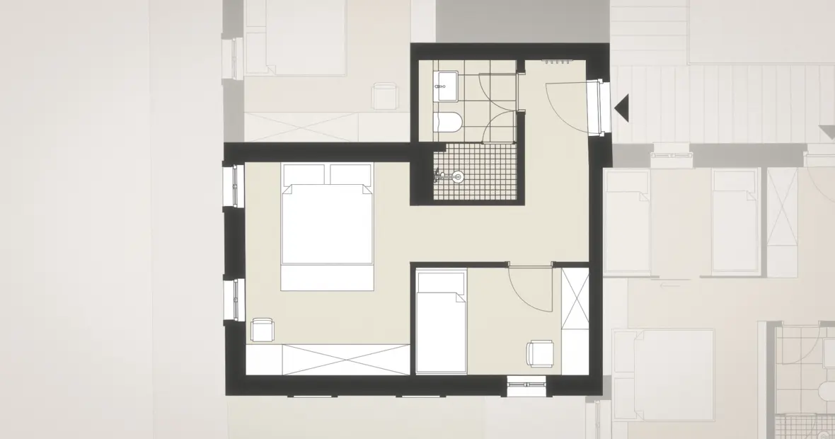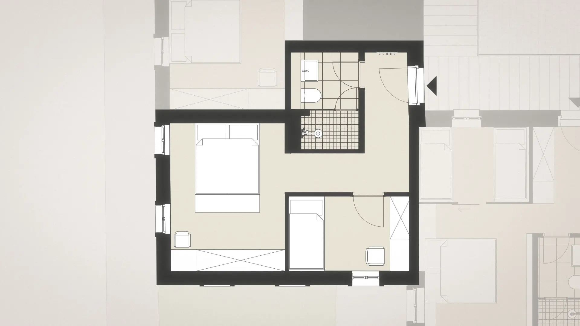 Offen, freundlich und wohltuend großzügig. Drei Schlafplätze, darunter ein abgetrennter Bereich mit Einzelbett, ein Schreibtisch für ruhige Stunden, viel Luft zum Atmen. Auch ein Hund darf hier mit ankommen. Ein Zimmer für alle, die gerne zusammen reisen und trotzdem Raum für sich schätzen.