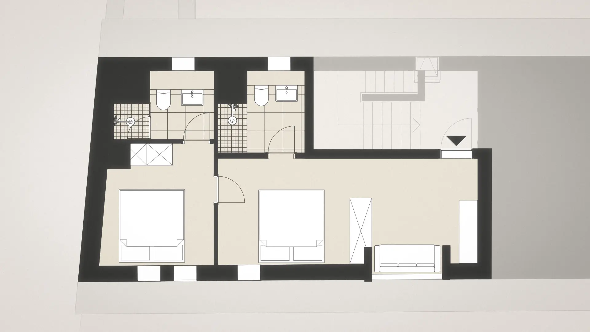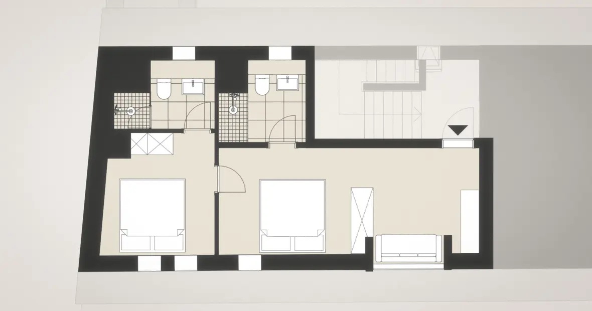 Hoch oben unterm historischen Dach entfaltet sich ein besonderer Rückzugsort: warmes Holz, sichtbares Tragwerk aus alten Balken, ein weicher Holzboden – alles durchdrungen von Licht und Weite. Die großzügige Gaube eröffnet einen atemberaubenden Blick über die „Schöne Höhe“. Zwei Bäder bieten Komfort, der separate Wohnbereich mit Sofa und TV lädt zum Verweilen ein. Hier ist Platz für bis zu sechs Personen – und genug Raum für Ruhe, Gespräche, Gedanken und Geschichten. Ein echtes Refugium über den Dingen.
